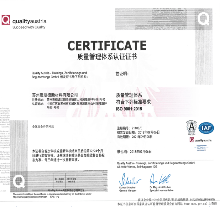 為了更好的使產(chǎn)品質量得到控制,使顧客更加滿意,內(nèi)部管理水平得以提升,降低企業(yè)的管理成本并提高公司的工作效率,蘇州康朋德大力在內(nèi)部推行ISO體系,讓公司管理更加系統(tǒng)和規(guī)范。并于2018年9月6日取得了認證。